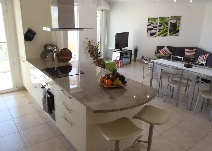 A kitchen with a refrigerator, an oven, and kitchenware is available in the property, along with coffee and tea makers. The 2-bedroom apartment is 20 km away from Nice Cote d'Azur airport. Guests have access to an aqua park and a sundeck, and various opportunities for diving, canoeing, and hiking. There is a terrace with the sea view.